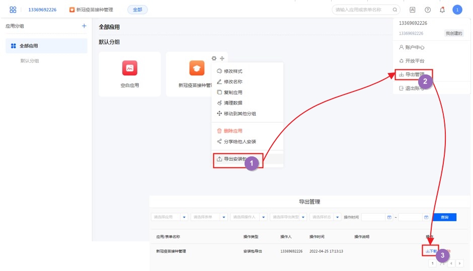 导出安装包适用于不同账号之间的应用迁移以及公有云应用迁移至私有云等。
