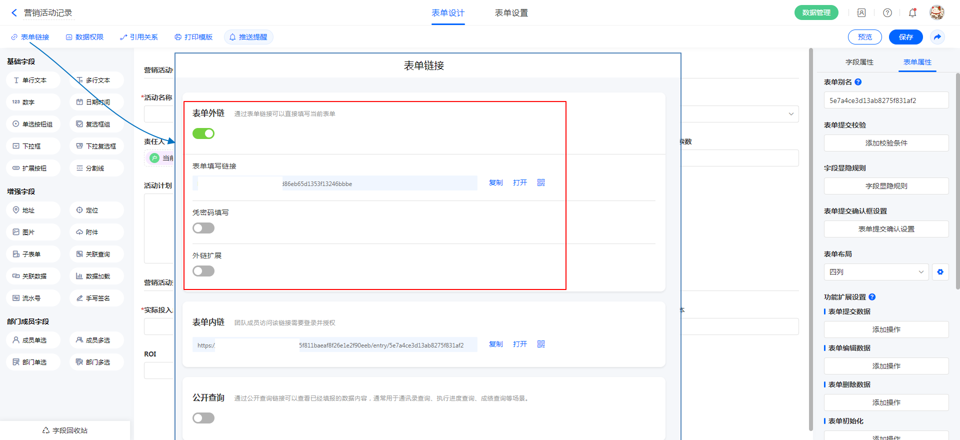 表单内链的打开方式:表单编辑页面 -> 表单链接 -> 表单内链。
