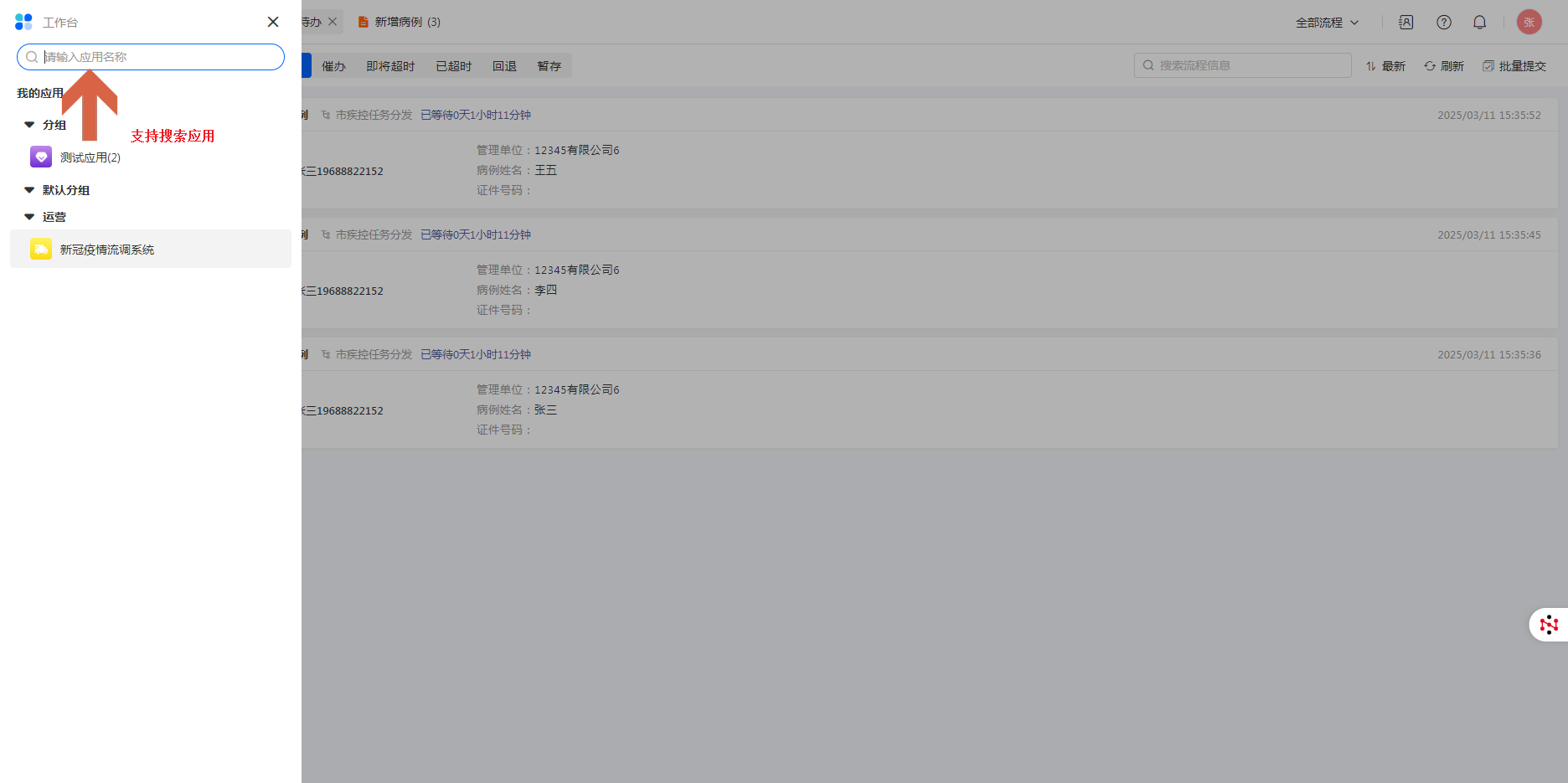 在工作台,可直接搜索全部应用。