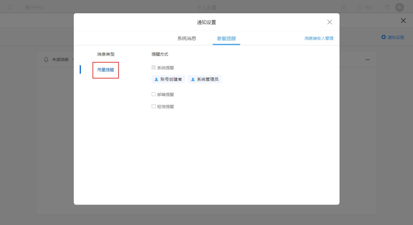 - 设置方式:勾选邮箱提醒方式,默认发送给账号创建者,还可以设置接收人,接收人可以在消息接收人管理中设置。
