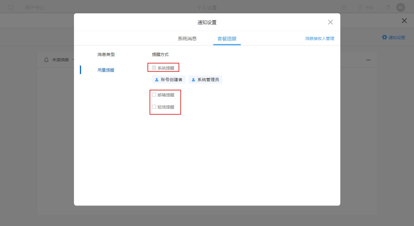 - 设置方式:勾选短信提醒方式,默认发送给账号创建者,还可以设置接收人,接收人可以在消息接收人管理中设置。
