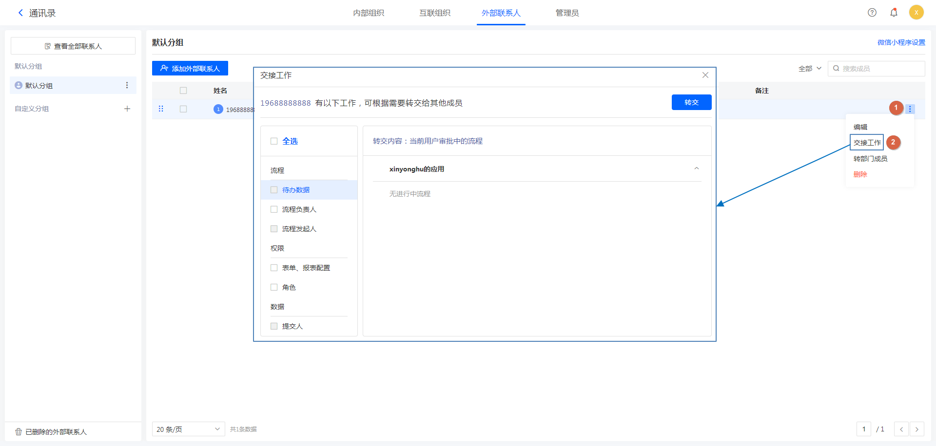 - 只有管理员可以操作工作交接,如果外部联系人为子管理员时,只能将外部联系人的工作转交给另一个外部联系人。