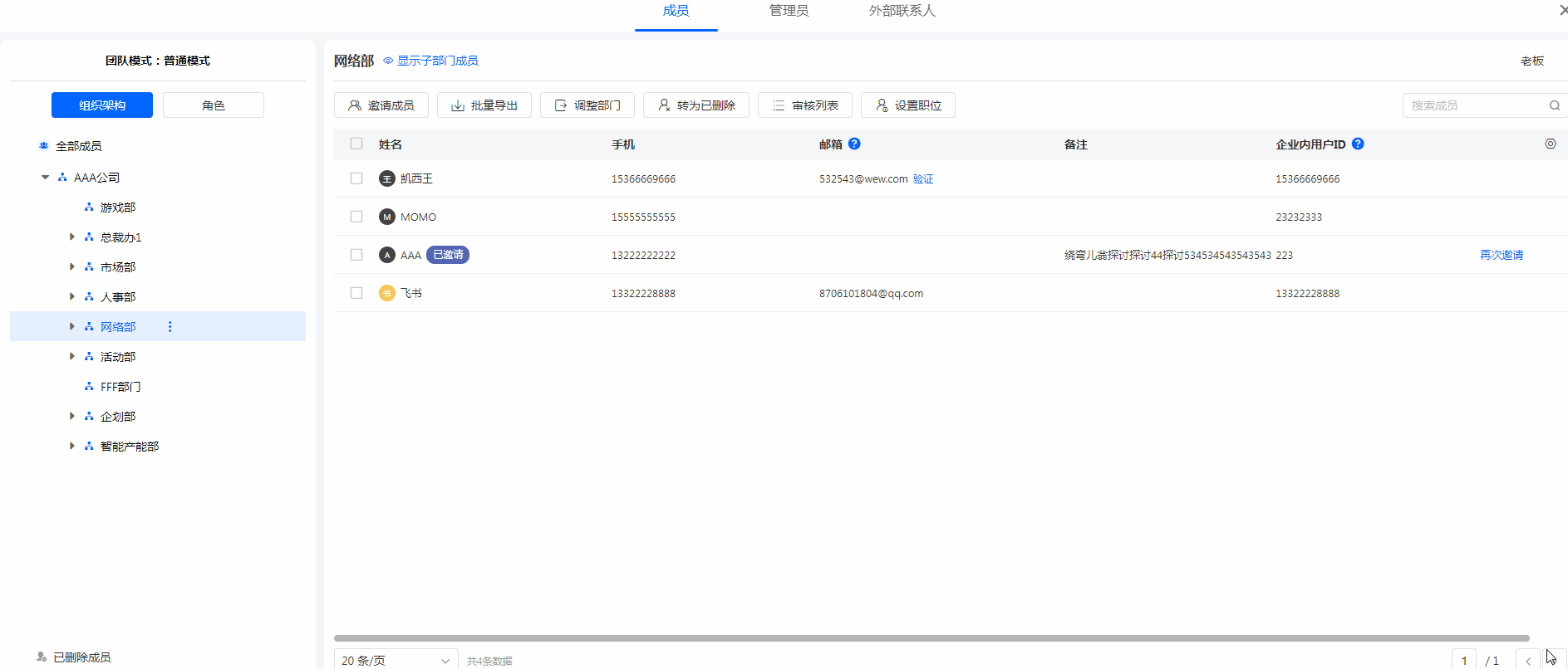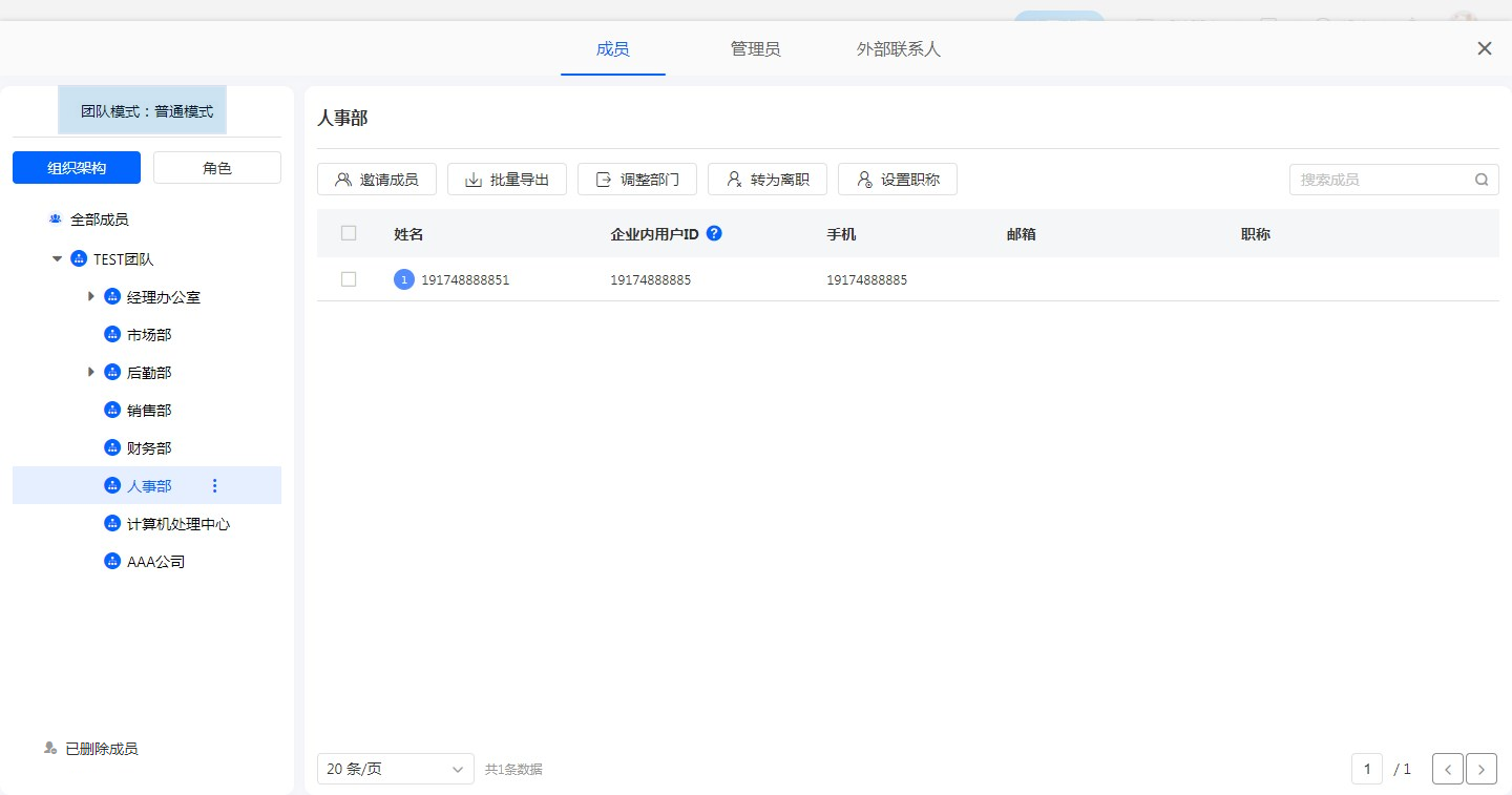在普通模式下,可以通过通讯录直接为企业组织添加成员,便捷的管理公司人员。
