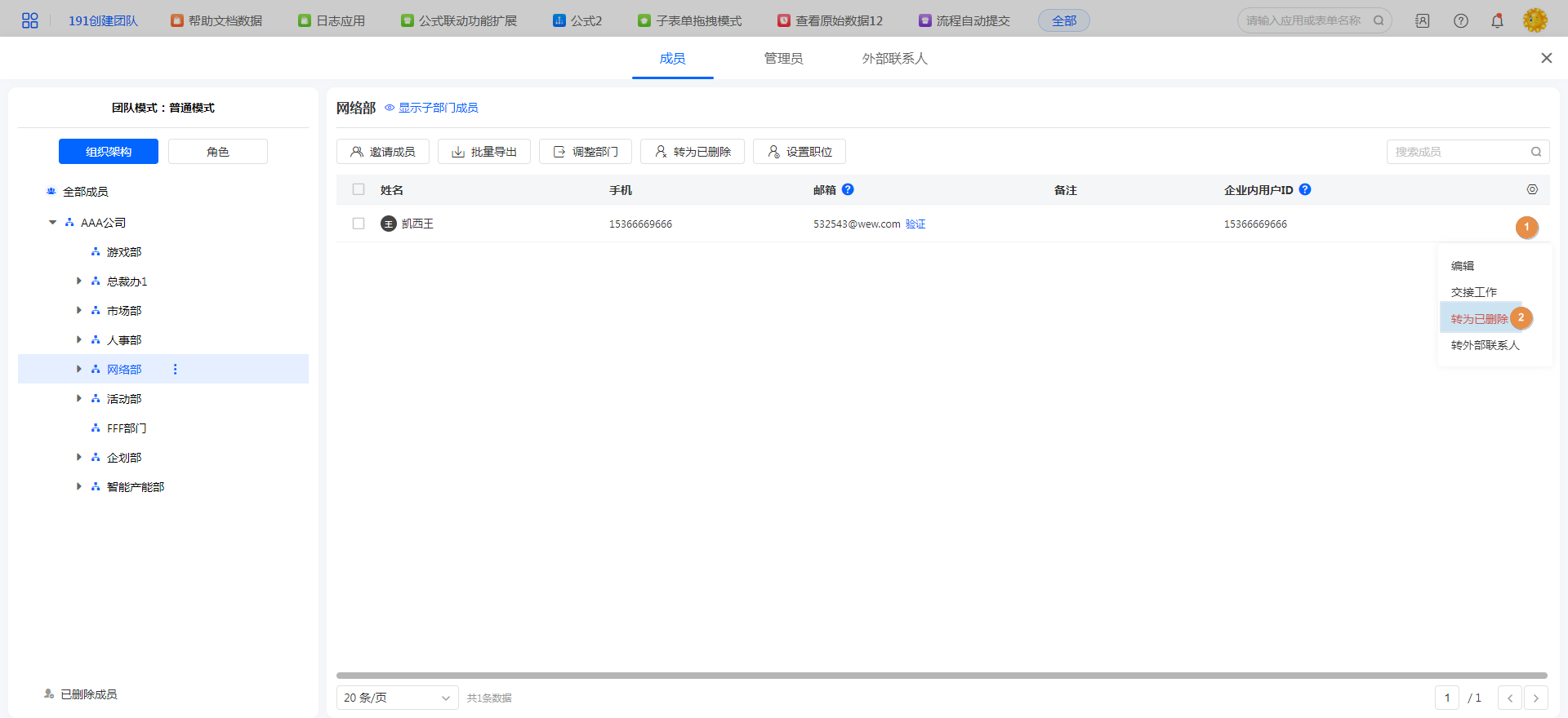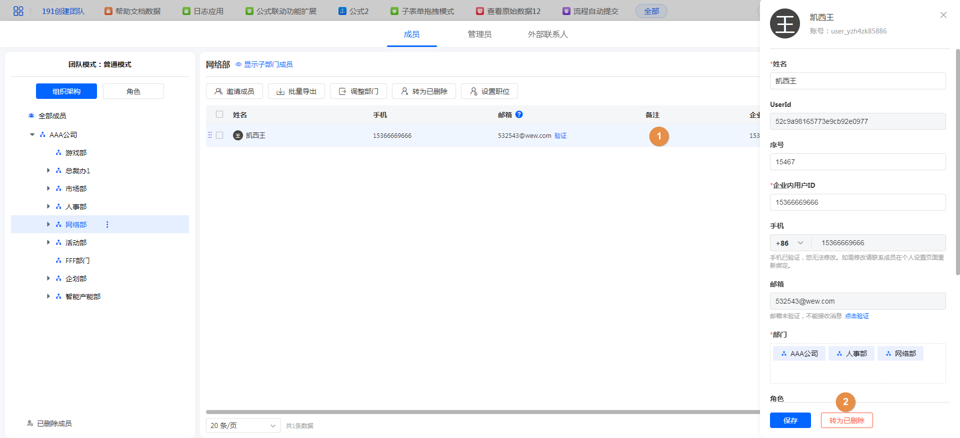 | 转为已删除:对成员进行删除操作。 注意:创建者不能被删除。 |