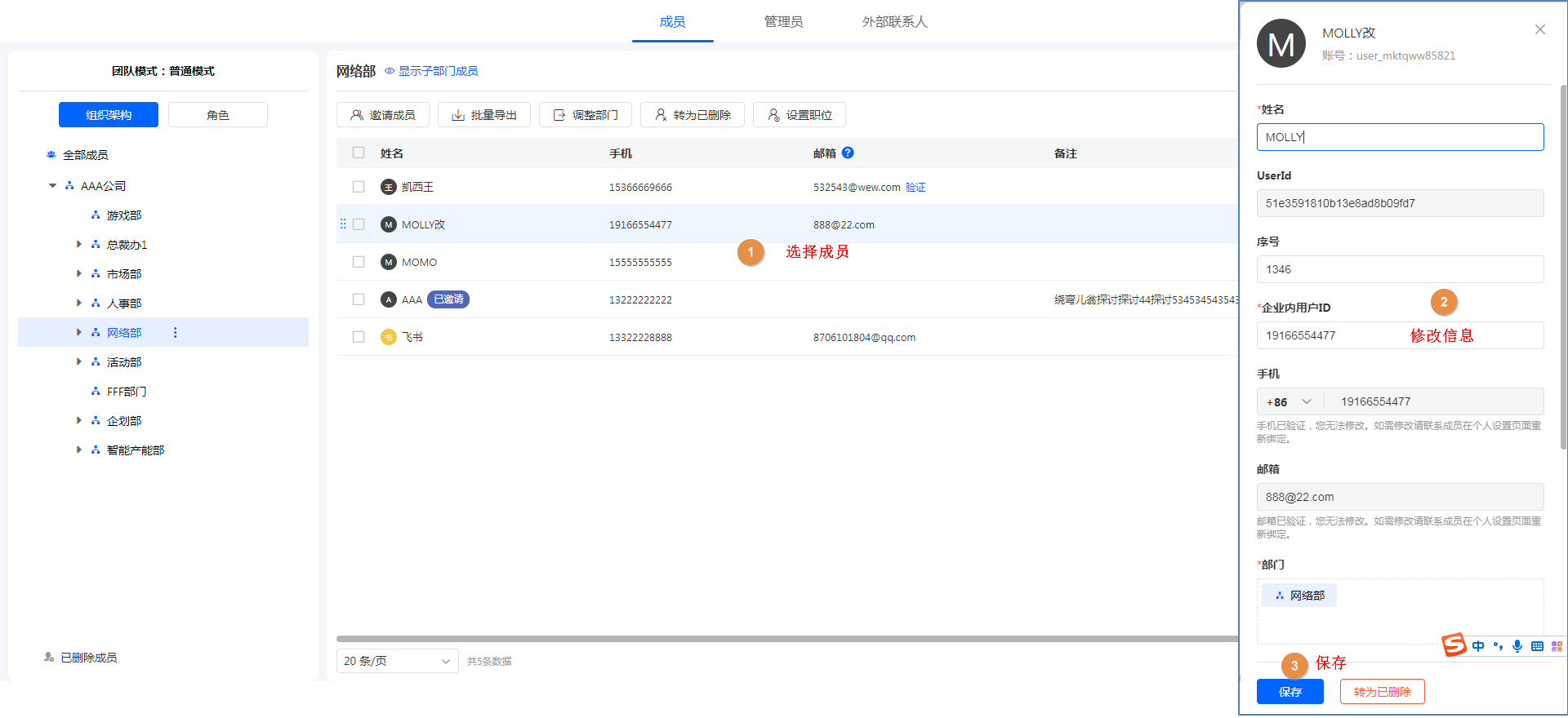 修改成员资料时,可以修改成员主部门。