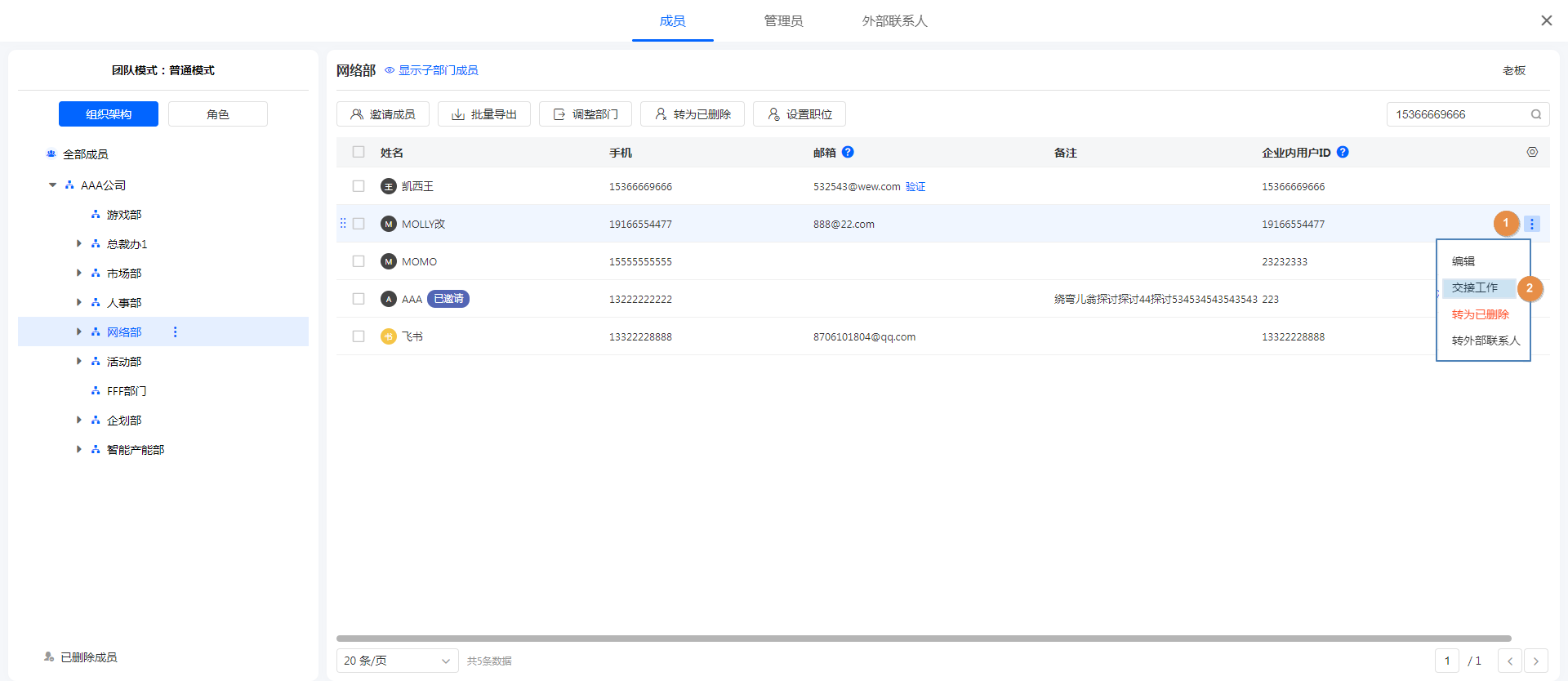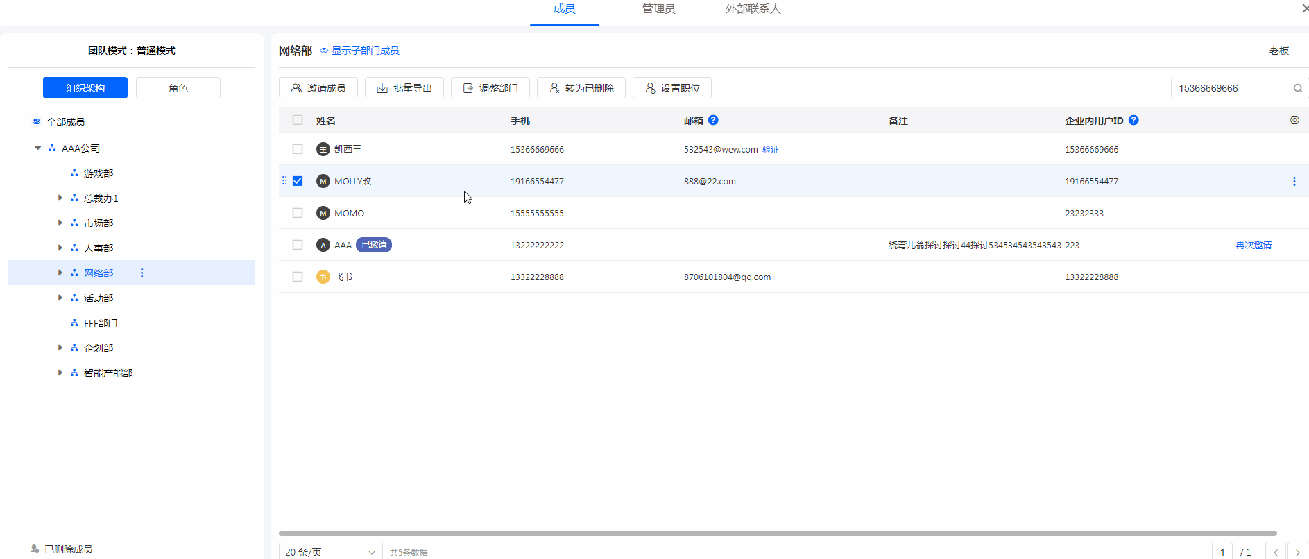 支持按姓名、手机、邮箱、职位进行模糊搜索,搜索范围为当前所选部门。