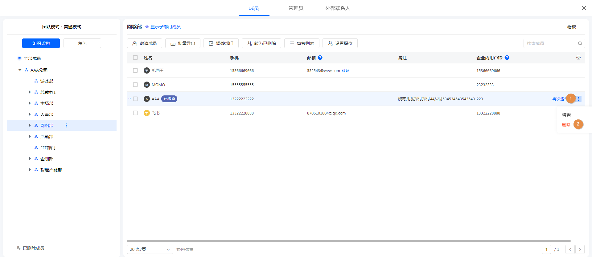| 删除:已邀请状态的成员可直接删除。 |