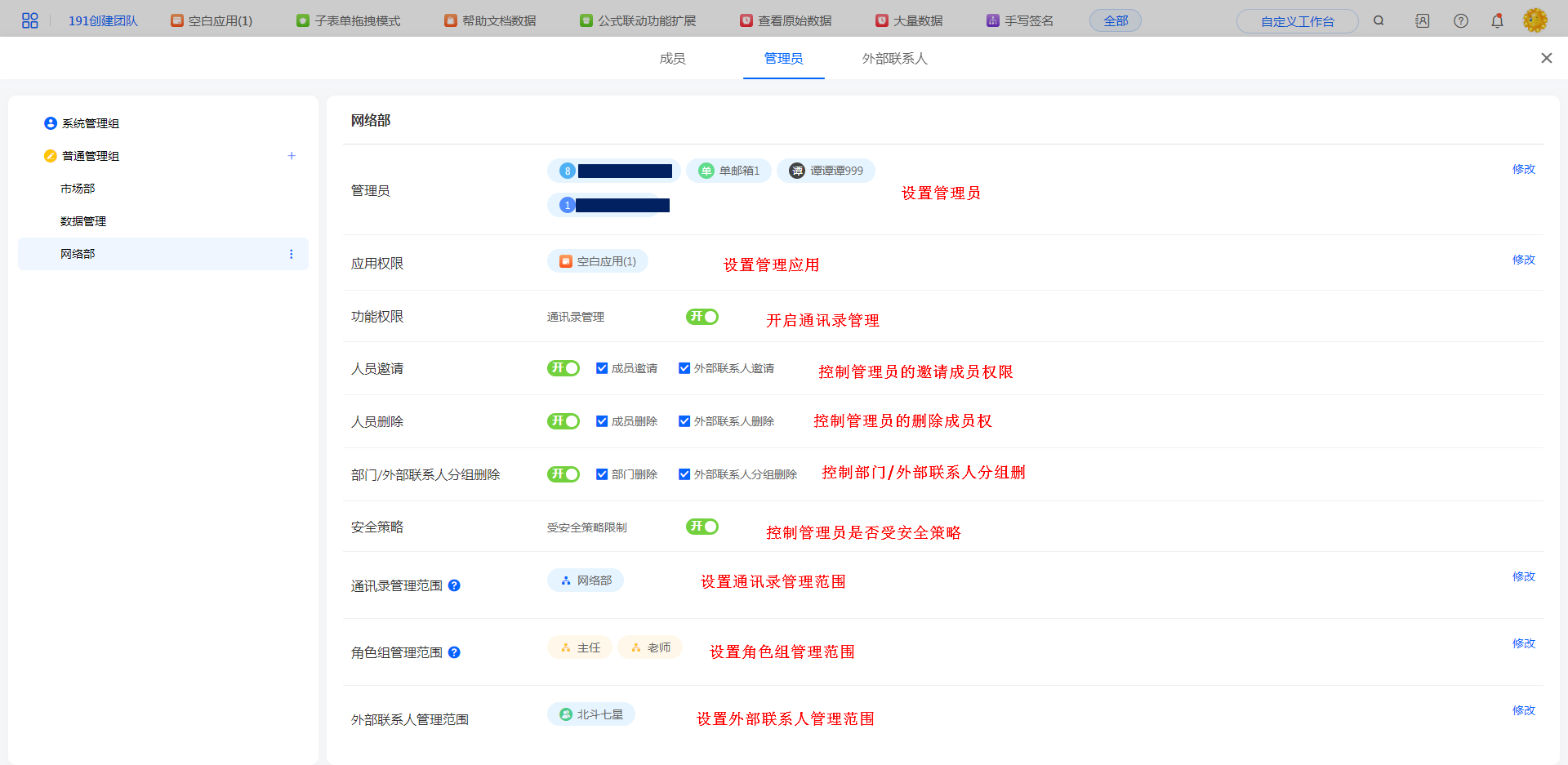 功能权限:开启【通讯录管理】,普通管理员可以进入通讯录进行相关权限操作;关闭则无法进入通讯录。