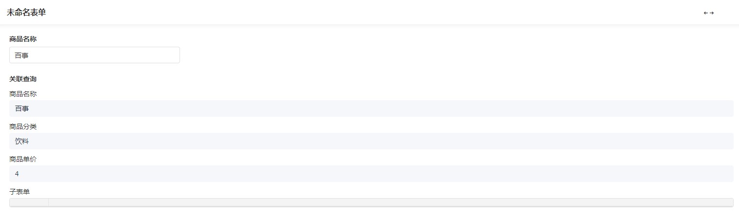 - 当关联查询为子表单字段时,仅新增数据页可展示;