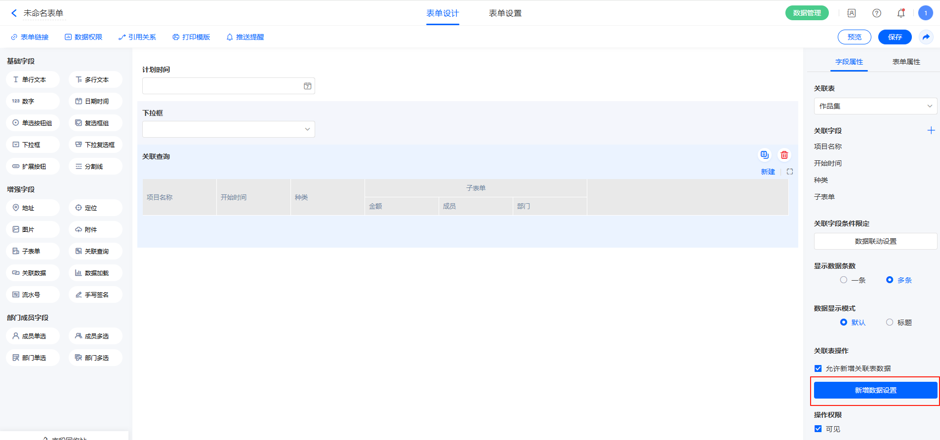 “多条”数据模式下,可设置“允许新增关联表数据”,通过点击关联查询字段的右上方""新建"可弹出被关联的表单进行新增数据。