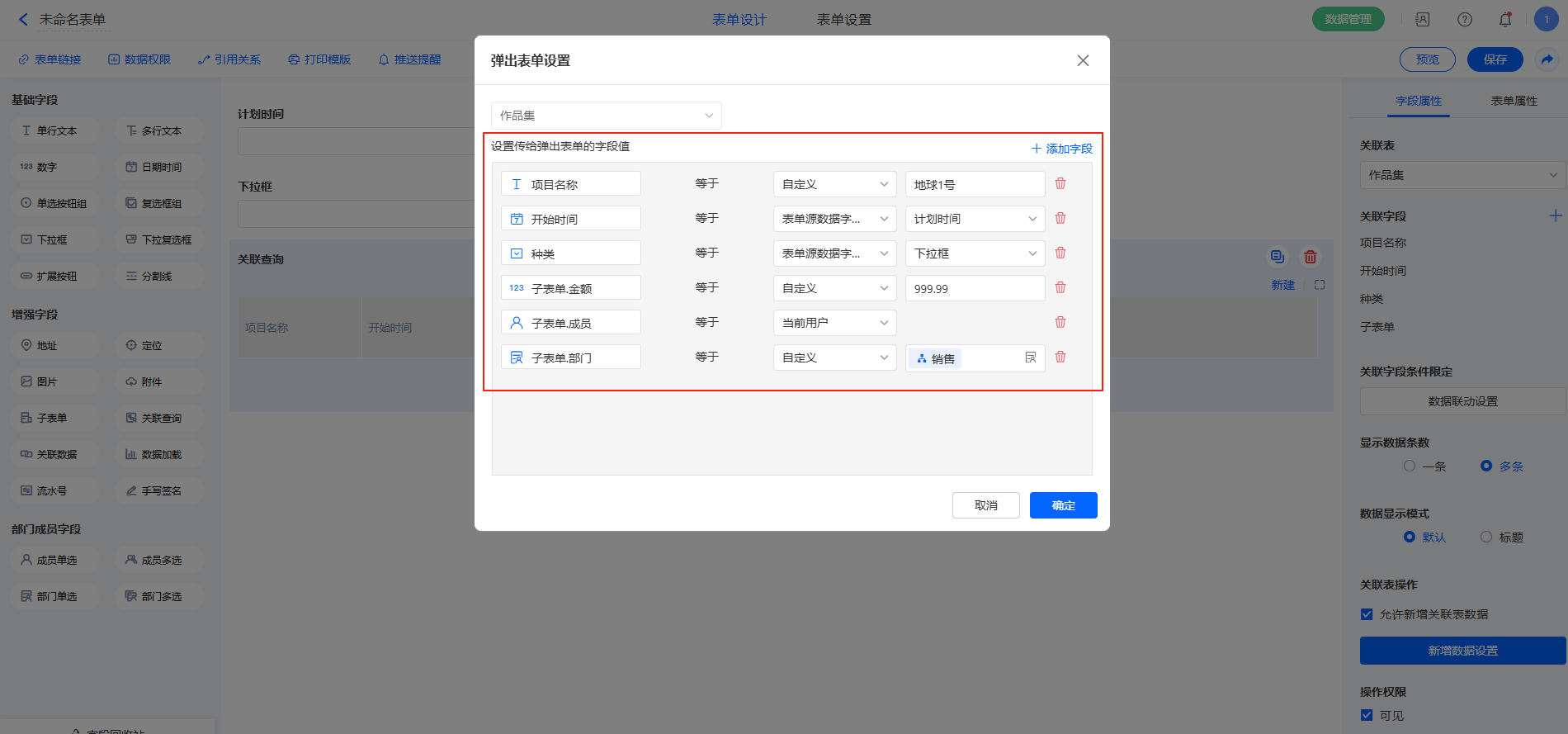 关联表操作>允许新增关联表数据支持"新增数据设置"传给弹出表单的字段值。