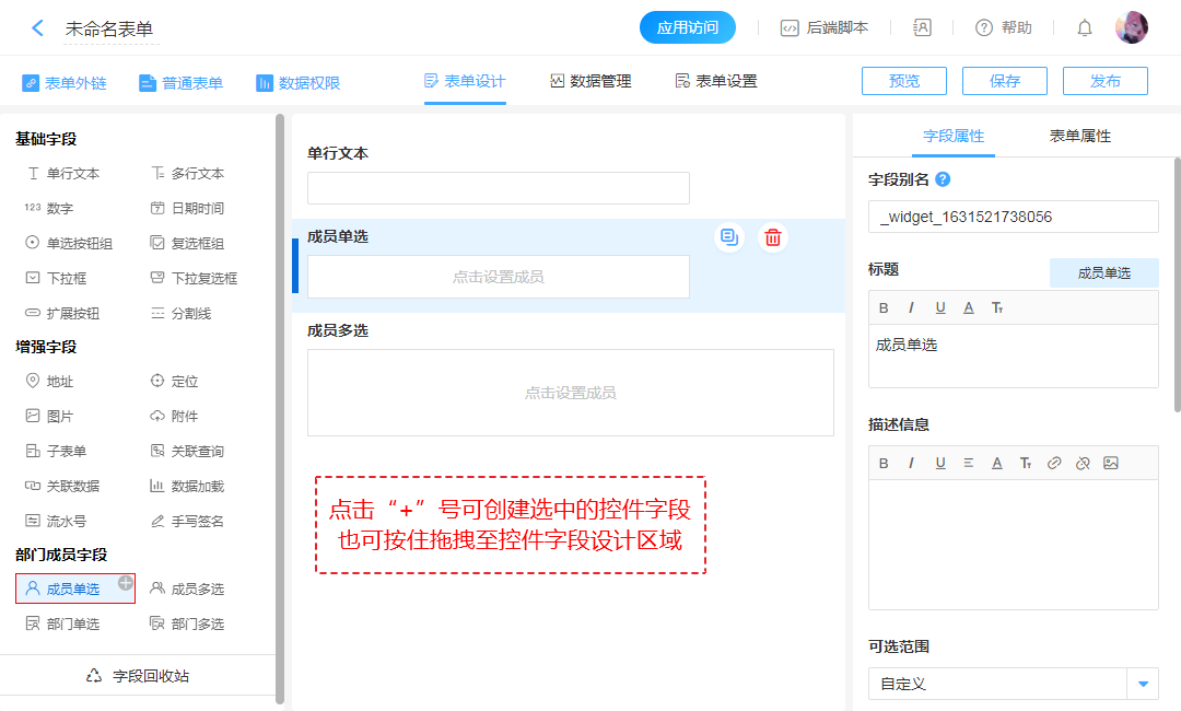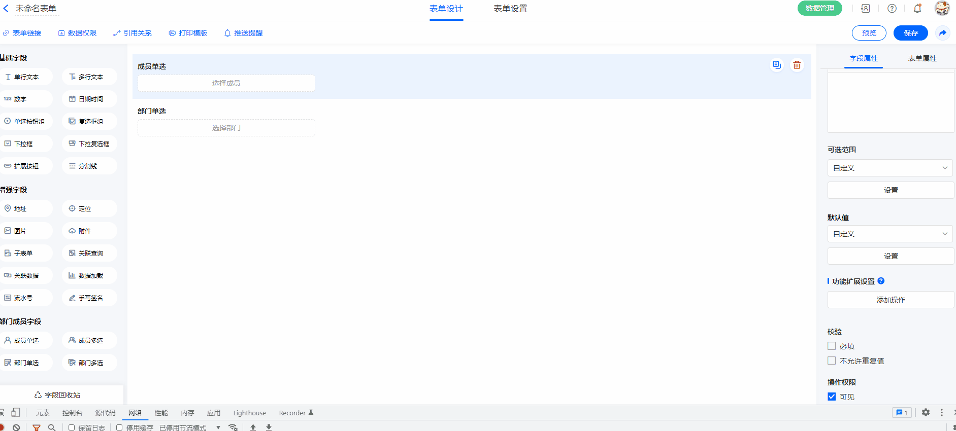 注意:表单外链不支持成员字段/部门字段,只有在系统数账号内访问表单,才可使用成员字段/部门字段。