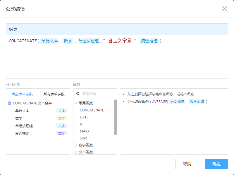 - 合并:单行文本、数字、单选按钮组、自定义常量、复选框组