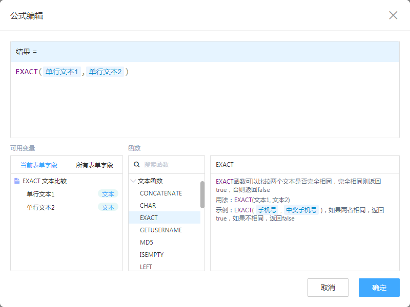 | EXACT(单行文本,"hello 世界") | 表单字段使用公式:true 数据助手和数据视图使用公式:1 |