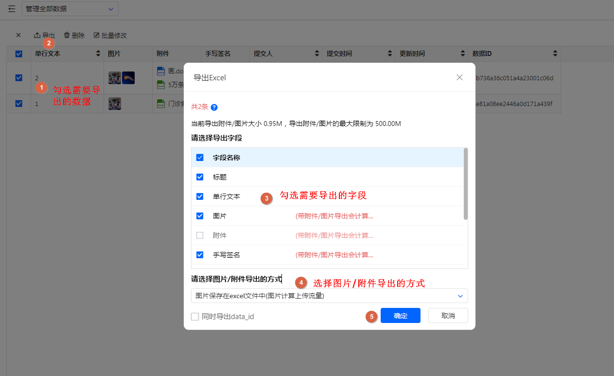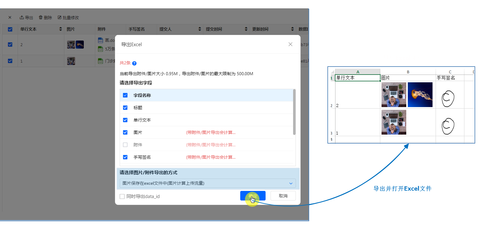 - 如果导出字段勾选了图片附件类型字段,则需要选择【图片/附件导出的方式】再执行导出操作。