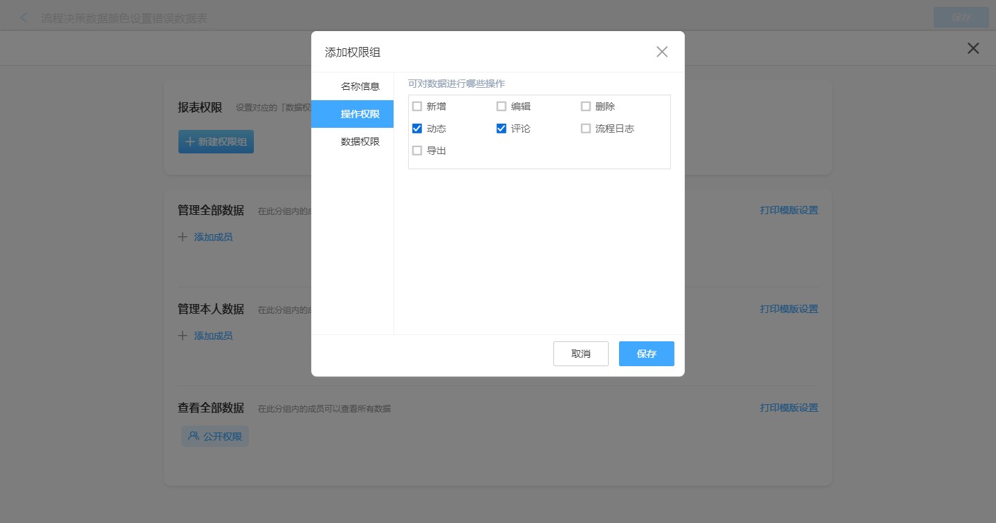 报表的操作权限同样可以设置数据动态与评论的权限,需要管理员添加自定义权限。