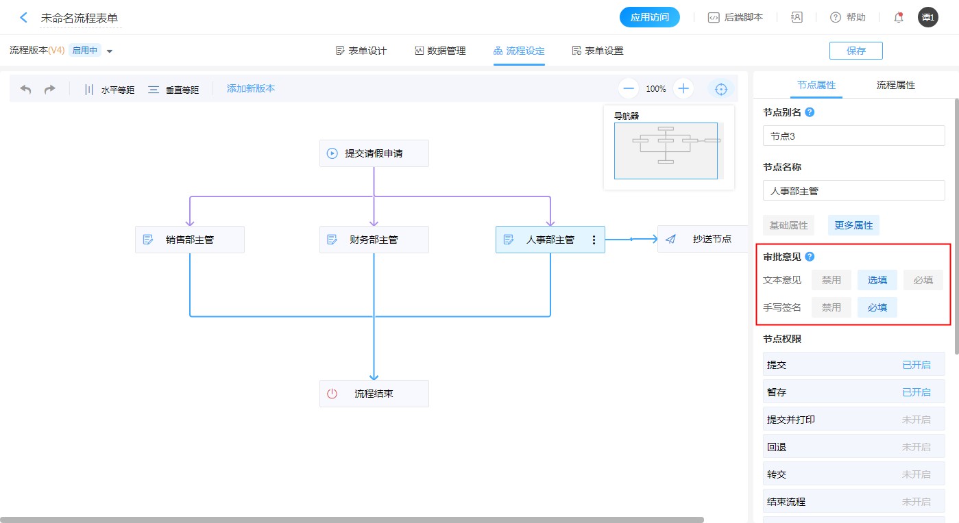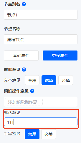【流程设定】——【点击某一节点】——【节点属性】——【更多属性】——【审批意见】