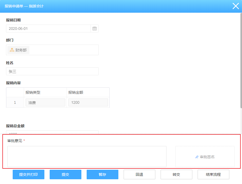 审批意见指的是流程在流转过程中,节点负责人通过提交文本意见或书写签名来处理流程的一种方式。