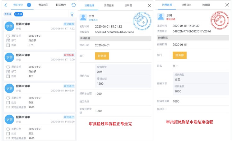 注意:审批通过指该流程正常流转完成,审批拒绝则是该流程在流程中途结束流程。