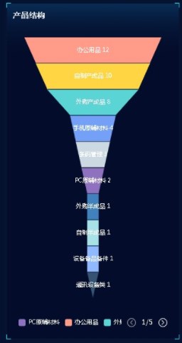 漏斗图适合有先后顺序的数据,由大到小,逐级减少的场景,如:客户转化率、产品结构等,如:进销存系统中,商品分析报表中就利用漏斗图实现的产品结构图,方便管理者了解当前产品结构。