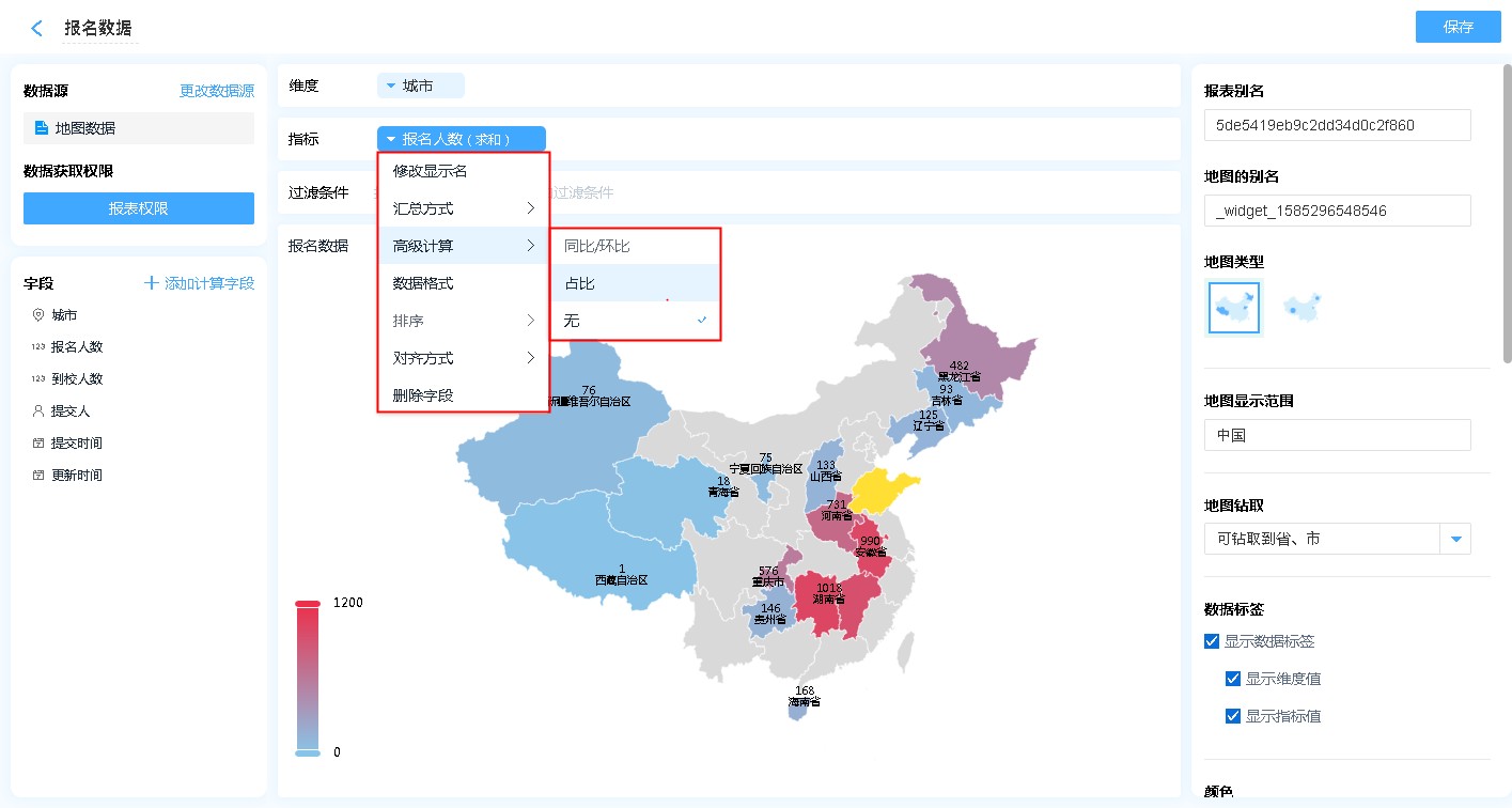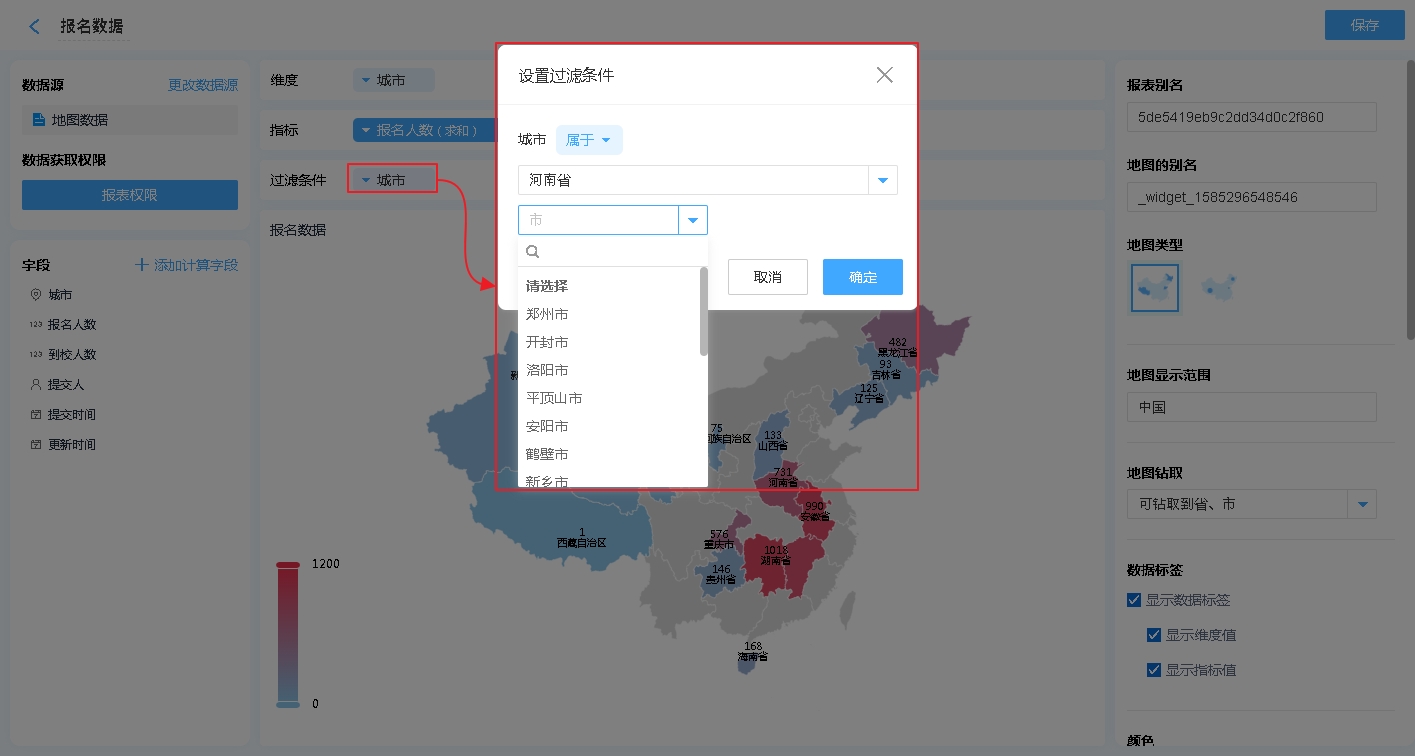 地图钻取可设置为[可钻取到省、市]、[可钻取到省]、[不启用]。