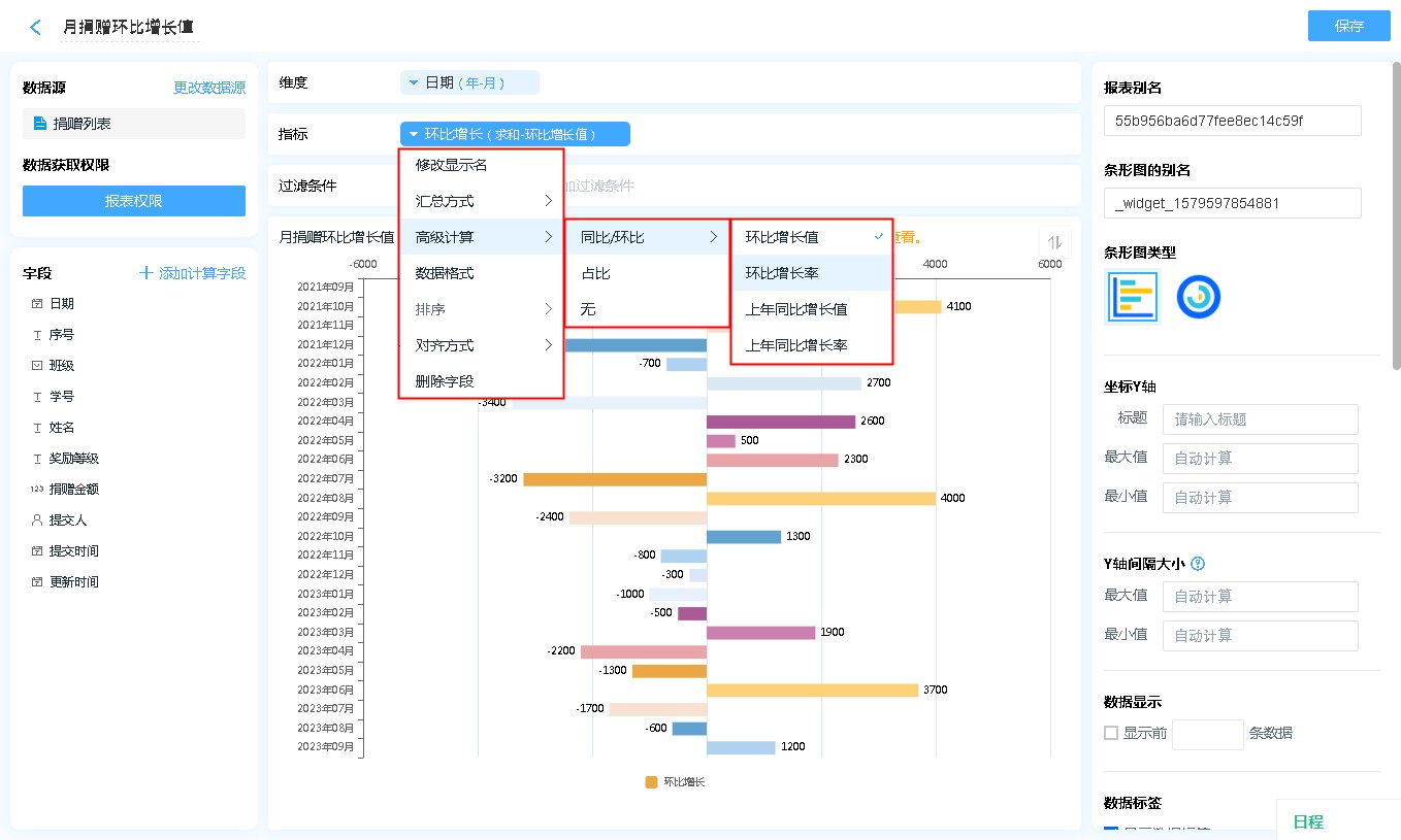 显示名称: 字段添加进入显示字段区域后,可自行修改其在条形图中的表头文字汇总方式: 指标的汇总方式仅支持数字字段,非数字字段在拖入指标中,汇总方式只有计数一项。高级计算:高级计算可进行同环比、占比的计算,详见同环比和占比。数据格式:可通过数据格式的设计,在报表中显示自己想要的格式,详见数据格式详解。排序:支持按照指定的格式对条形图内的数据进行排序[默认为数据创建时间]对齐方式:支持报表单元格文字的排列方式删除字段:此处的删除字段,是指从指标中删除,删除后仍可重新添加,不会对原表造成任何影响。