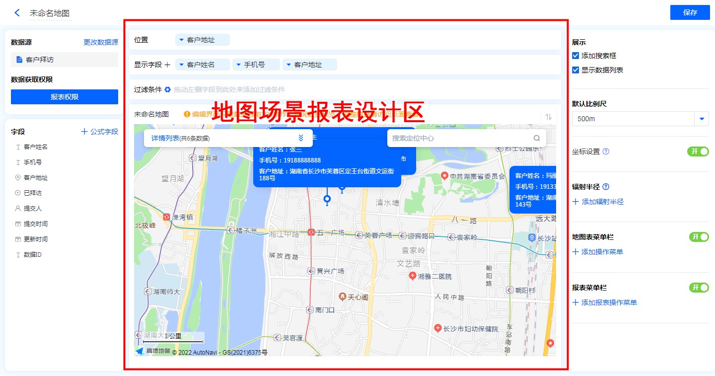 地图场景报表的设计区分为 位置、显示字段、过滤条件以及数据显示区。
