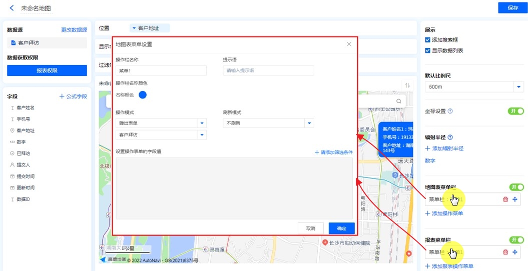 地图表菜单栏 支持 弹出表单、弹出报表、数据助手、功能插件、后端开发