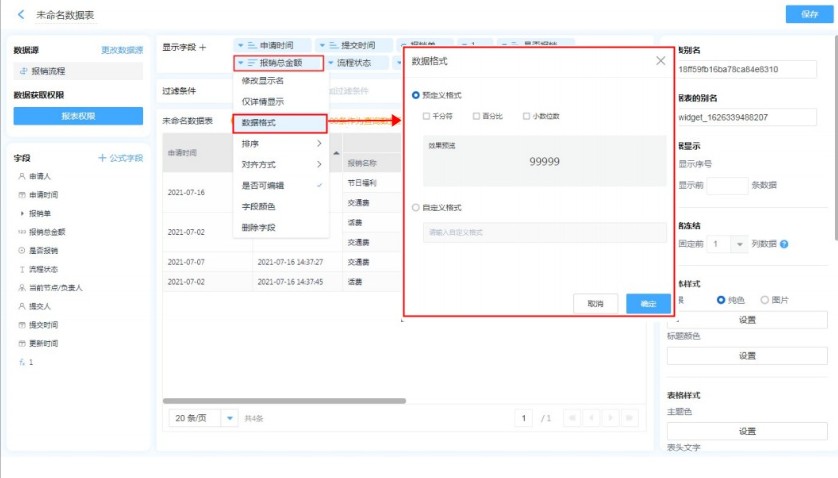 地址字段,日期字段,数字字段的格式设置很简单,只需要在报表中编辑字段,选择自己需要的格式即可。