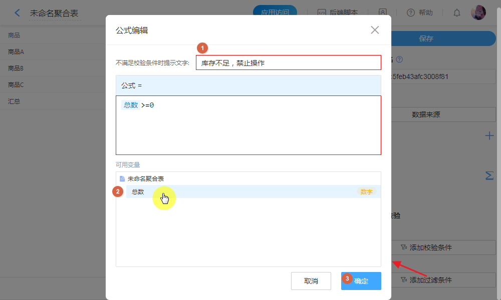 关联表单数据变更时,会触发聚合表计算“指标”所配公式,最终结果如无法符合“校验条件”,则拦截本次数据变更操作,并浮窗提示以上所配提示文字。