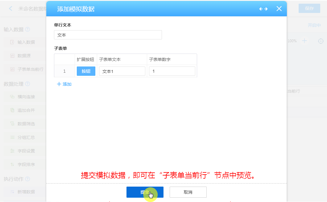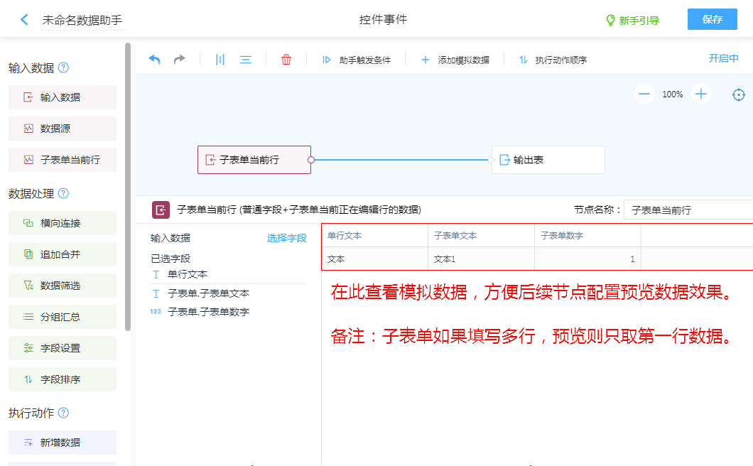 可以查看已添加的模拟数据,方便后续节点配置预览效果。 备注:子表单如果填写多行,预览则只取第一行数据。