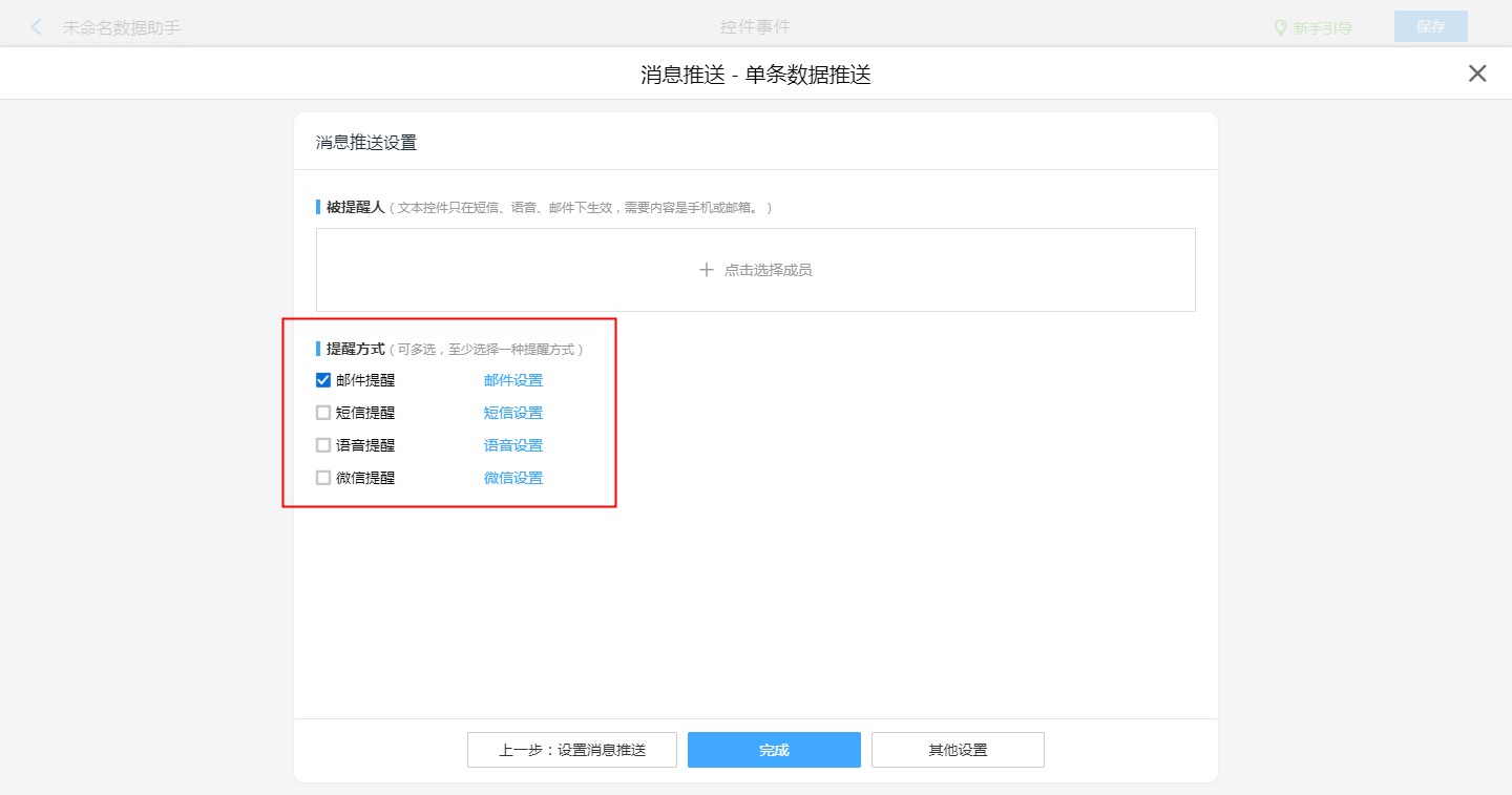将输出表内的所有数据进行以短信/邮件/语音通知/微信提醒的方式发送给指定的成员或部门或手机号或邮箱。