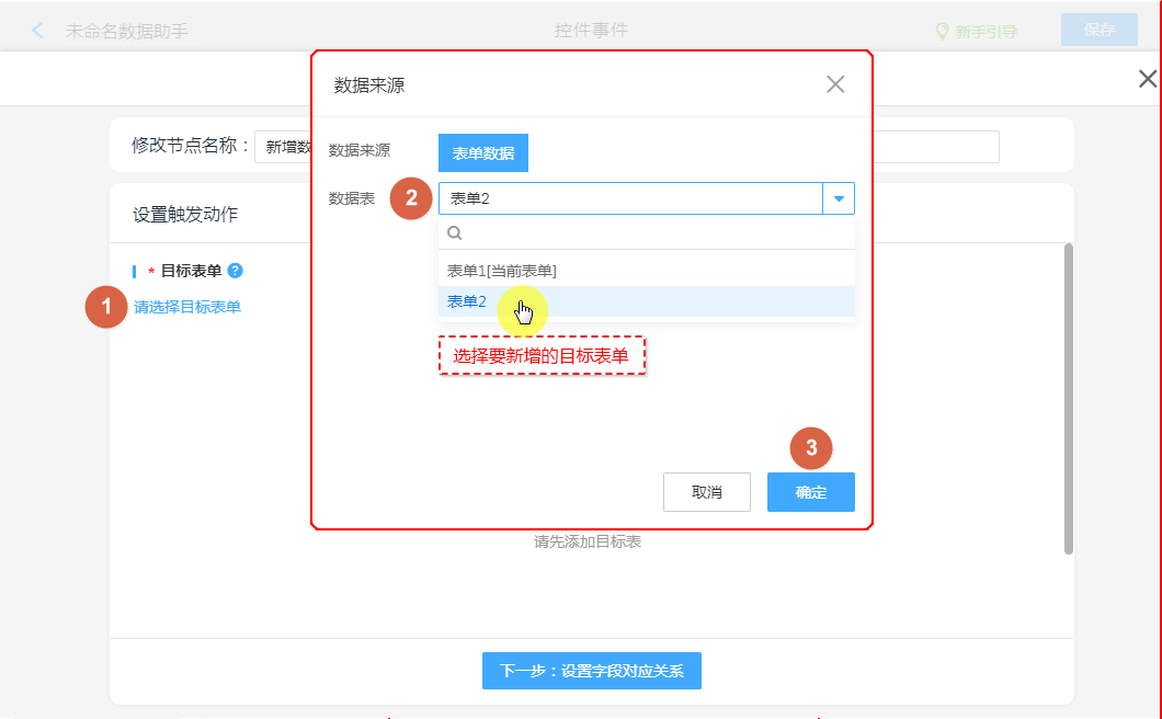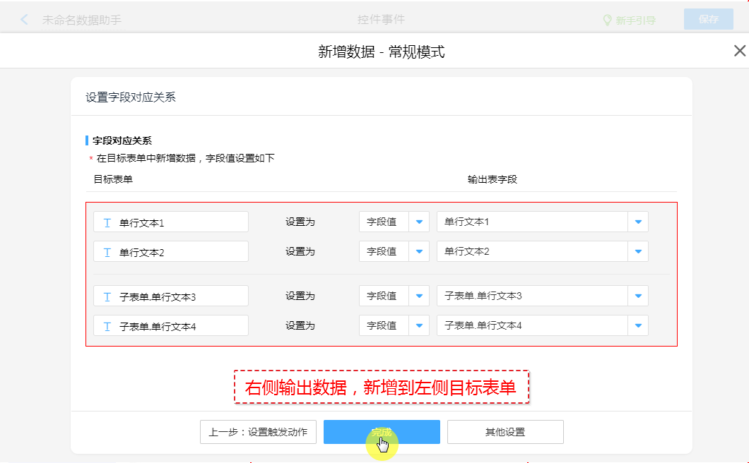 创建“新增数据”动作节点,将“输出表”的数据新增至其他表单。
