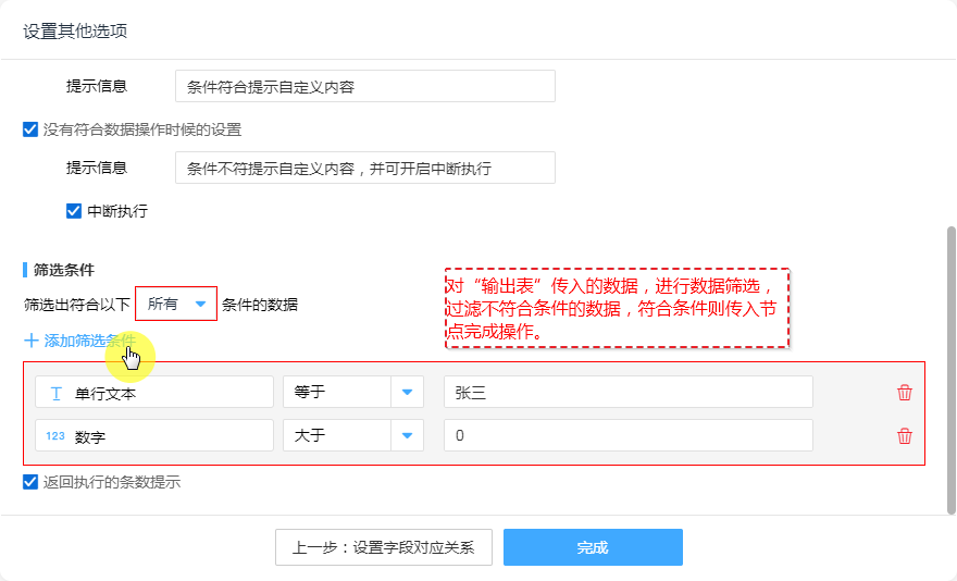 - 输出表数据满足以下“所有”条件触发执行动作。